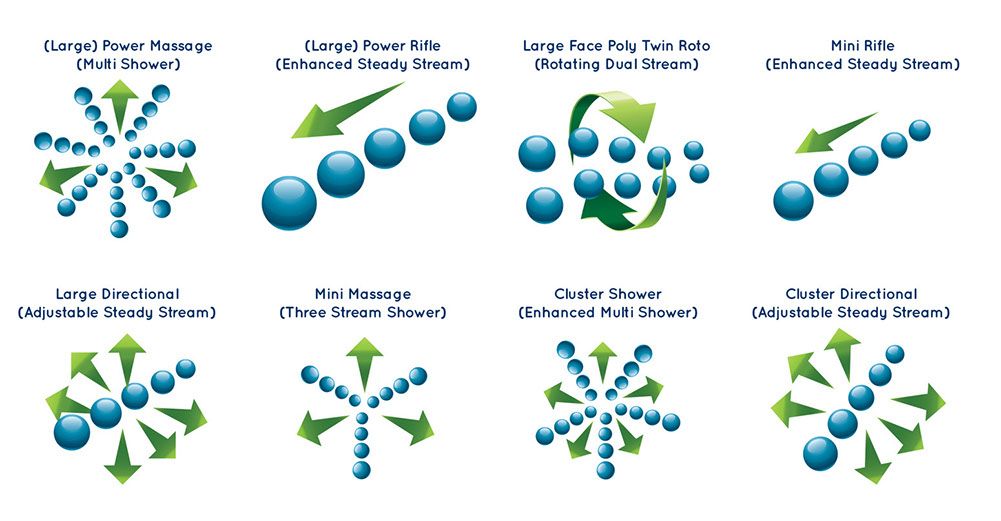• Les jets sont mobiles pour que vous puissiez les réorganiser en fonction de ce qui vous convient le mieux • Le placement des jets cible les principaux groupes musculaires pour un soulagement rapide de la douleur et du stress • Les jets réglables et interchangeables vous permettent de personnaliser l'action • Les commandes de déviation permettent à l'utilisateur d'ajuster la quantité de Pression de l'eau à chaque siège
